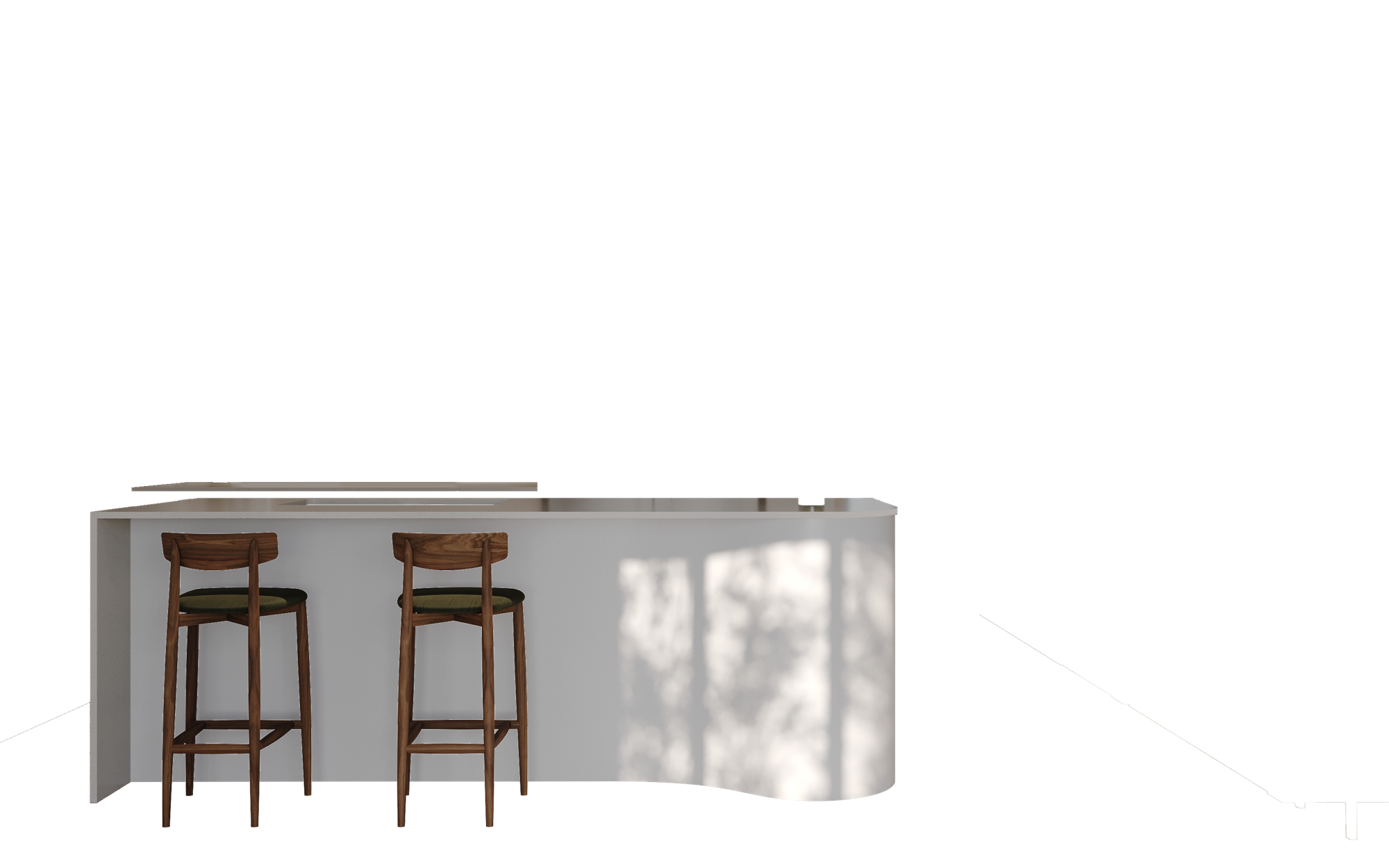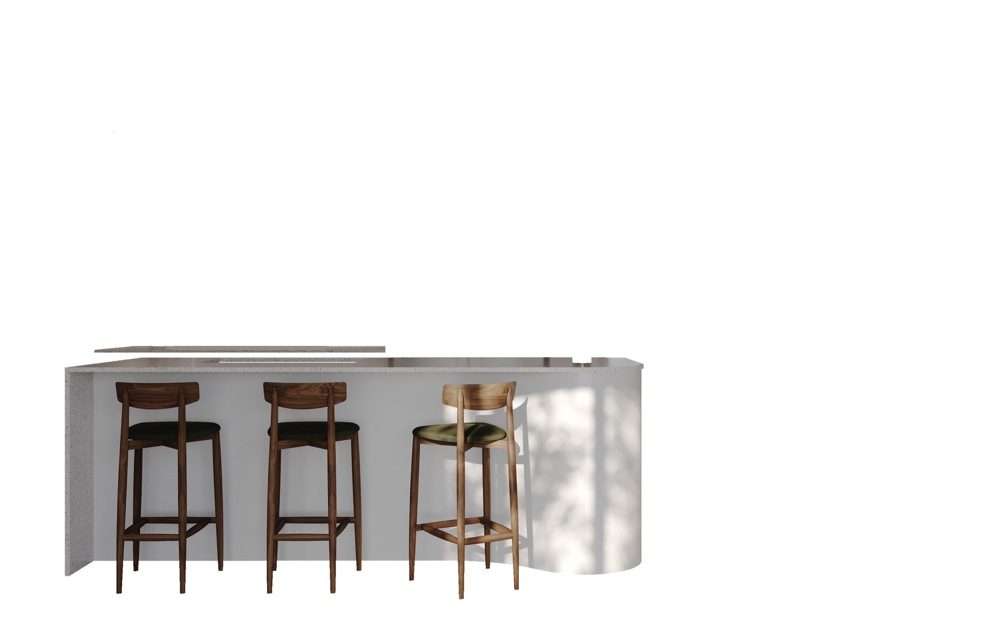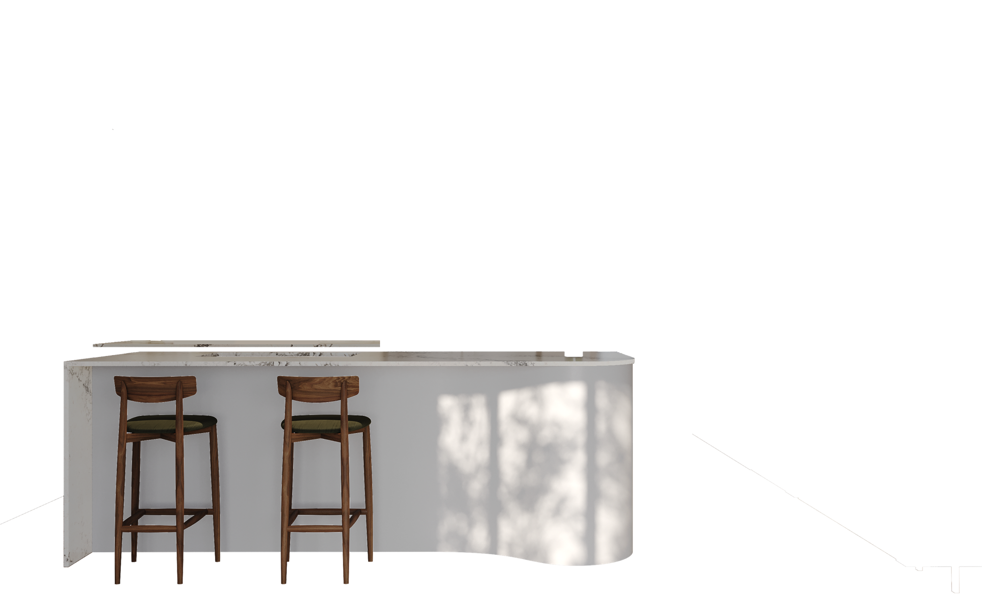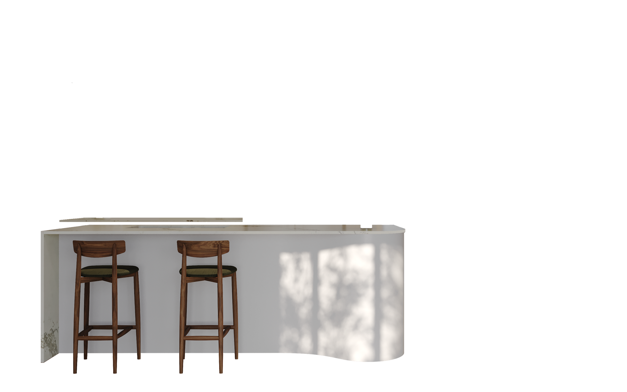 Feature curved island benchtop with x1 waterfall end with upgraded supernatural mineral stone.